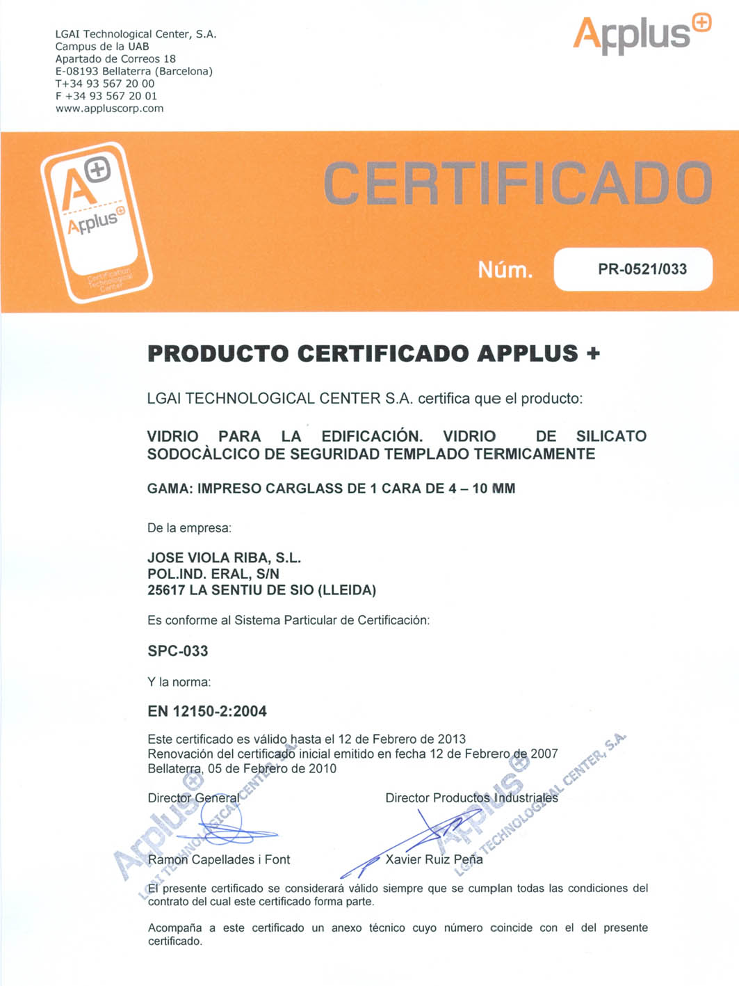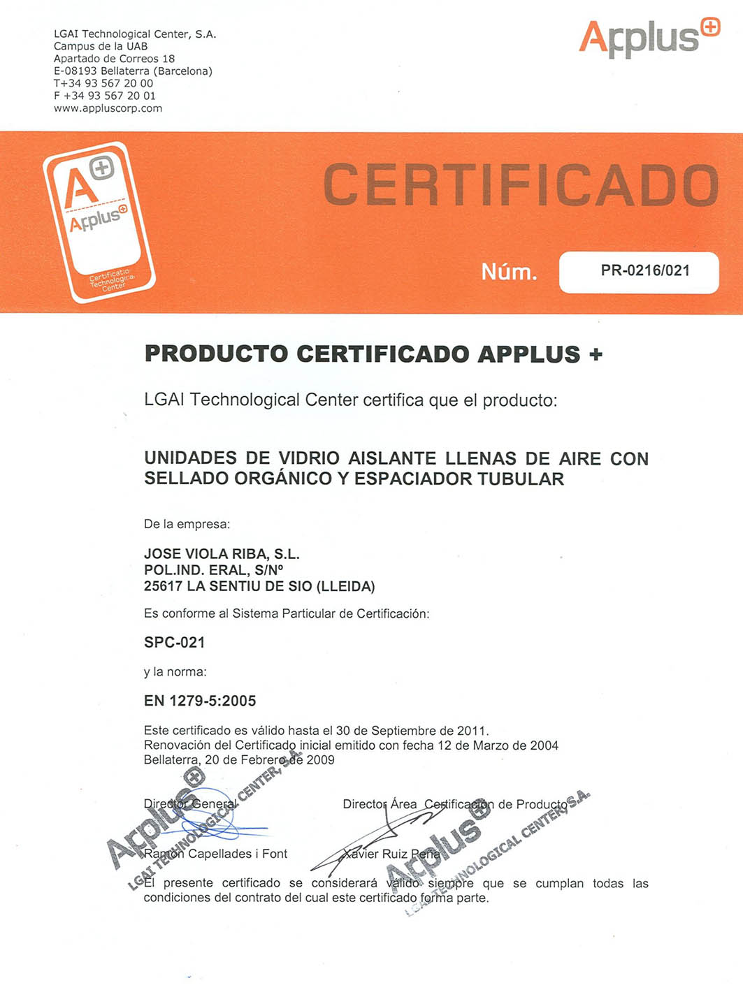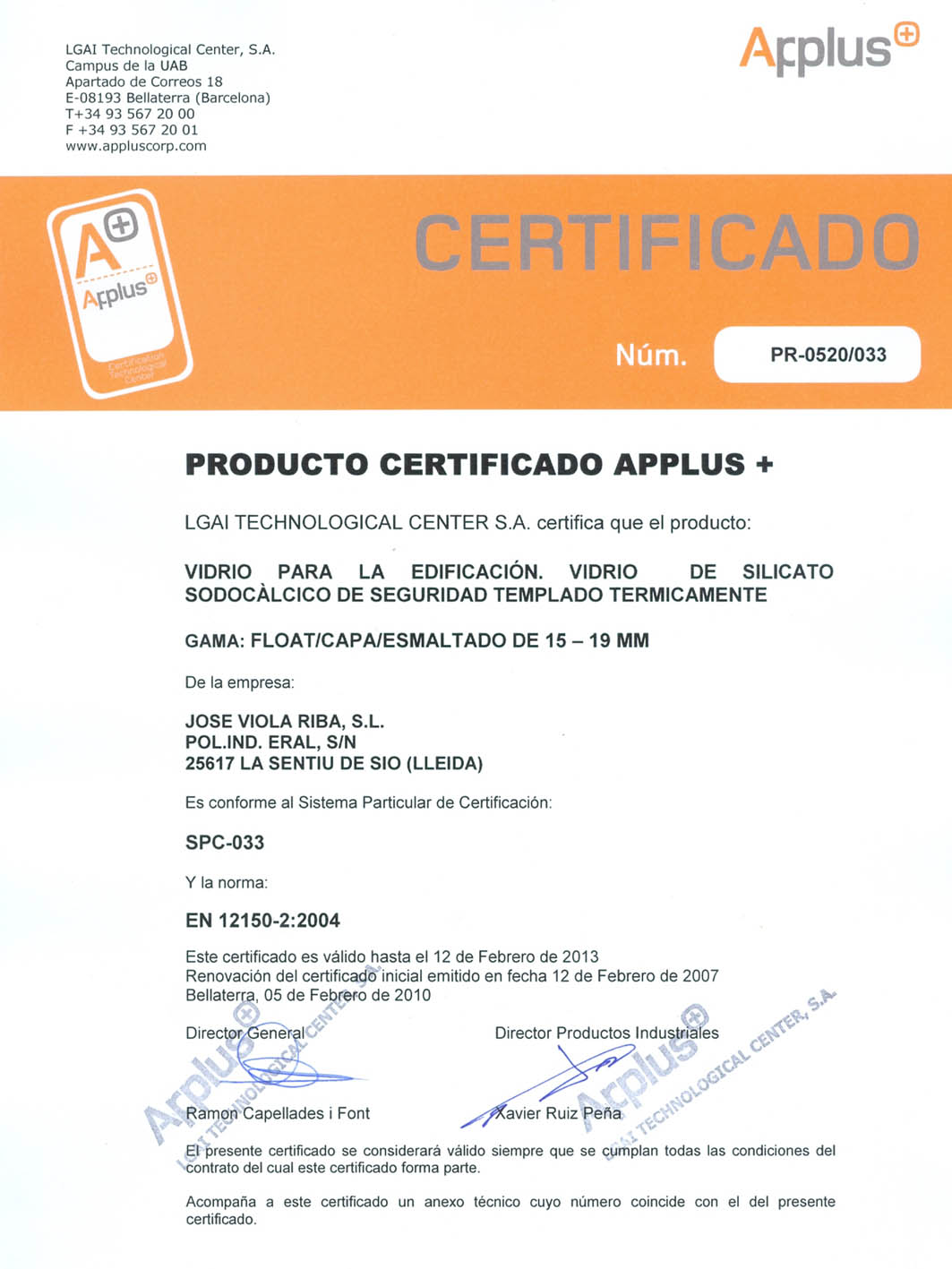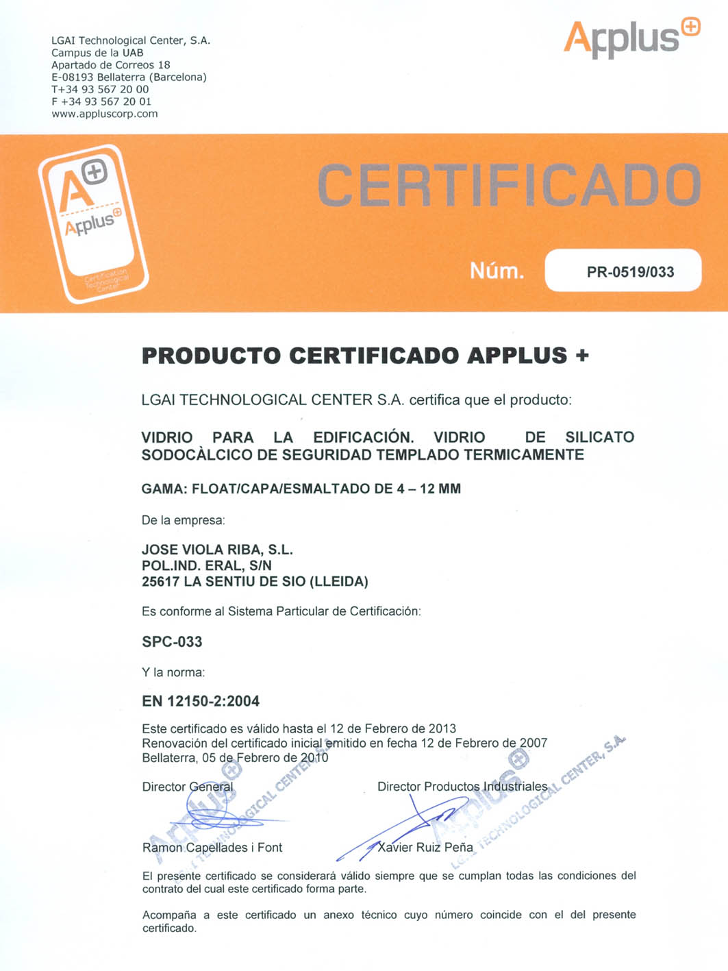 Then we show examples of Applus quality certificates, which complies with our supplier of glass. |